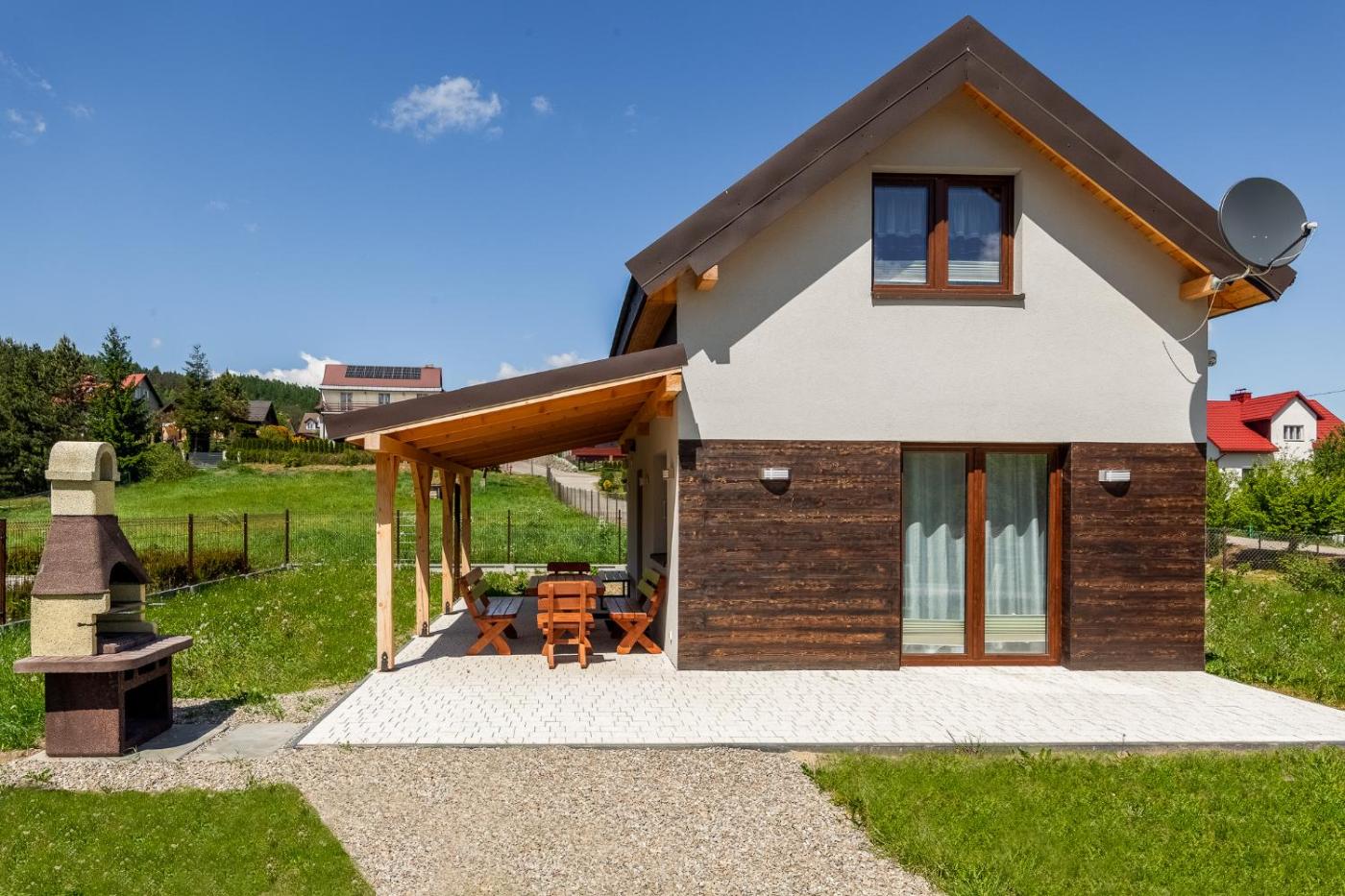 Dom z 2 sypialniami. Featuring a private entrance, this holiday home consists of 1 living room, 2 separate bedrooms and 2 bathrooms with a shower. Guests can make meals in the kitchen that is equipped with a stovetop, a refrigerator, a dishwasher and kitchenware. Boasting a terrace with garden views, this holiday home also provides a washing machine and a flat-screen TV with satellite channels. The unit offers 4 beds. Dom wakacyjny - 6 osobowy. Powierzchnia pokoju ok.: 70 mkw.